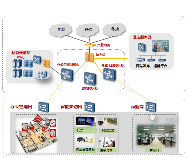 酒店的基礎網絡作為整個酒店業務運營的基礎,不但承載著酒店的核心業務,同時也為客戶提供方便的網絡服務,對酒店至關重要。酒店基礎網絡一般由客房網,辦公網以及安全監控網組成,客房網負責為客戶提供穩定、安全的語音,數據及Internet接入服務,辦公網負責酒店的正常業務運營,支撐員工的信息化辦公等,安全監控網負責酒店的視頻信號的傳輸與存儲,以及承載其它弱電系統數據,確保酒店的安全管理。