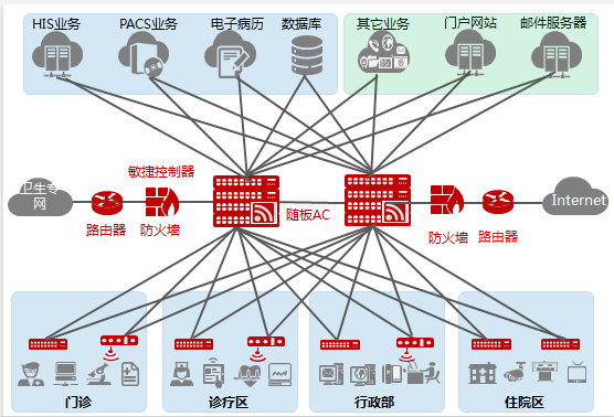 內網(wǎng):也稱為HIS網(wǎng)絡,主要承載醫(yī)療核心業(yè)務,如HIS、LIS、PACS等業(yè)務數(shù)據(jù)傳輸,要求高寬帶、大容量和高速率,并需考慮未來擴容、帶寬升級。