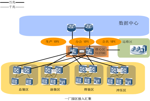 核心部署兩臺S12708核心路由。負責整個園區路由交換處理,匯聚點全部萬兆雙上行到核心。