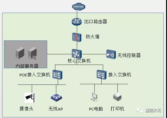 針對30~100人規模SOHO型企業,出口網關推薦采用華為企業級SOHO路由器,集成Wi-Fi/AC控制器等,同時提供防火墻、上網行為管控等特性。網絡核心部署華為S1720-28GWR-4P-E交換機,維護簡單;接入側采用S1700系列SOHO交換機,以及AP3010DN-V2,滿足中小企業無線終端和有線終端的混合接入。
